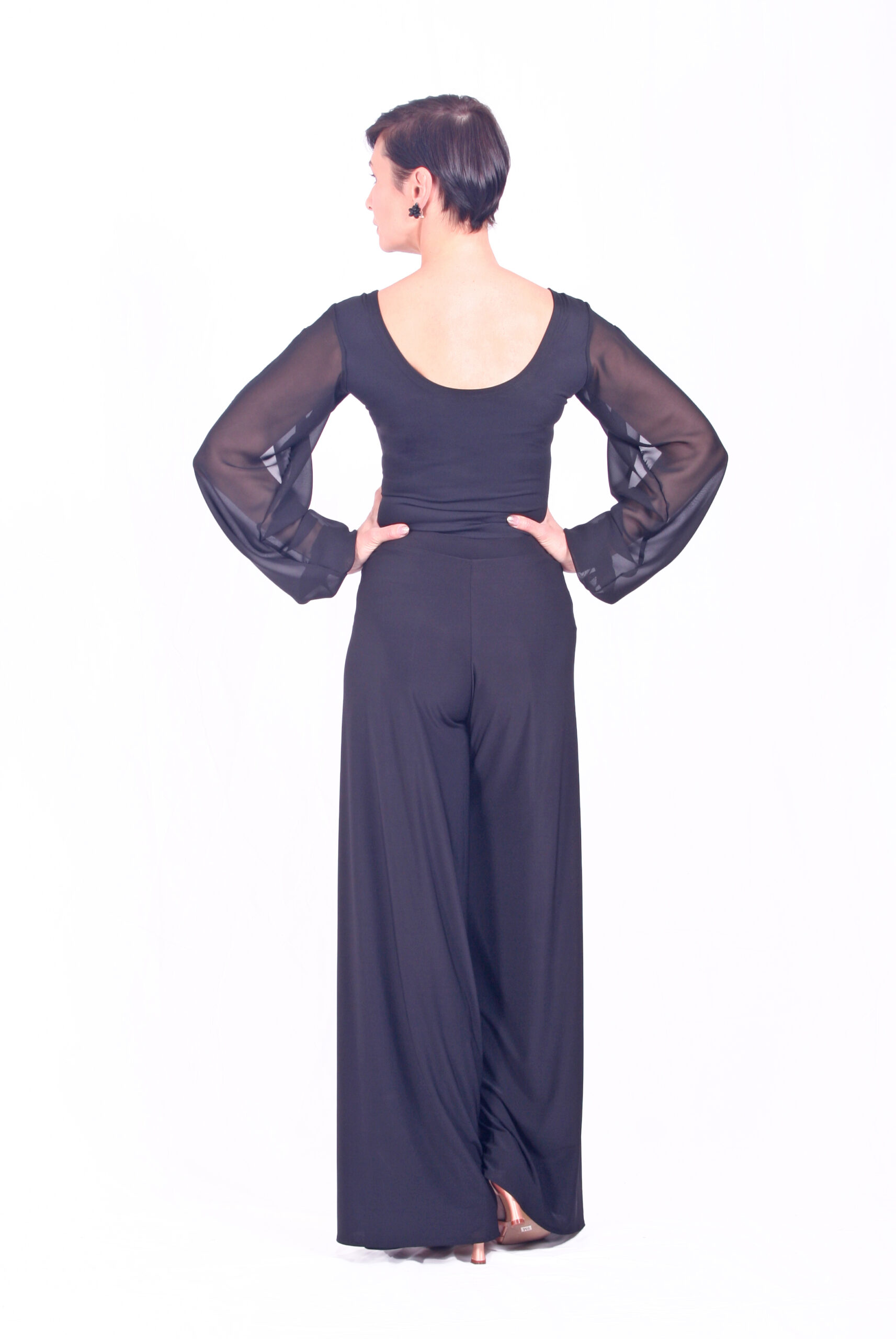 Taneční body s průhlednými chiffonovými rukávy s prostřihy. S hlubším kulatým výstřihem na zádech.
