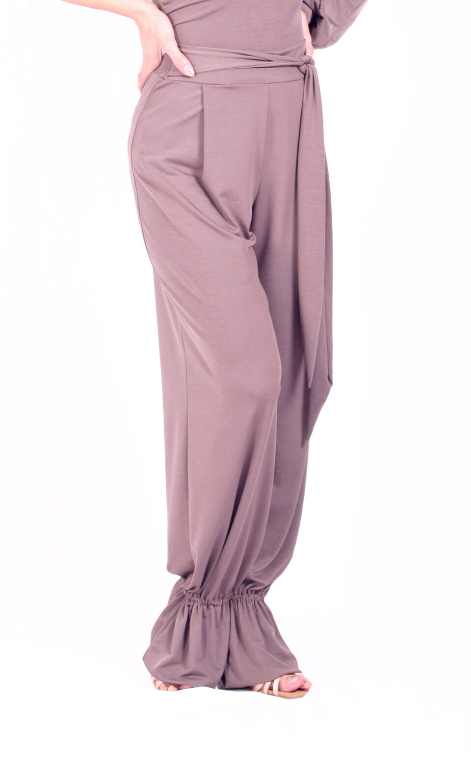 Taneční tréninkové kalhoty se „zvonečky“ u kotníků, kde jsou utažené všitou tenkou gumičkou. Kalhoty mají sklady, zavazovací mašli a volný pohodlný pas bez gumy.