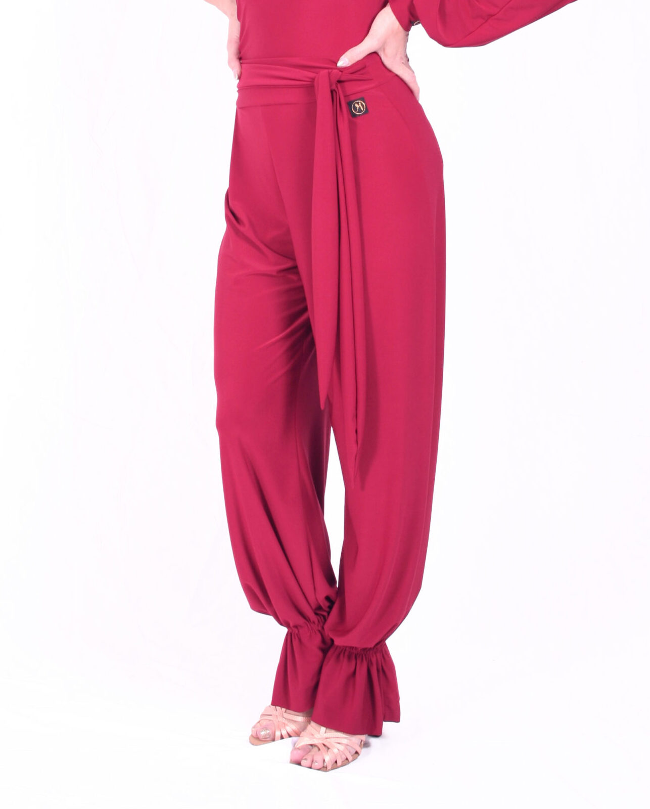 Taneční tréninkové kalhoty se „zvonečky“ u kotníků, kde jsou utažené všitou tenkou gumičkou. Kalhoty mají sklady, zavazovací mašli a volný pohodlný pas bez gumy.